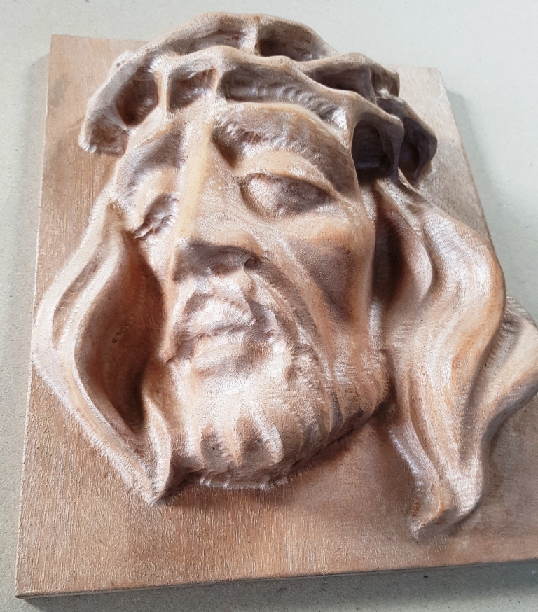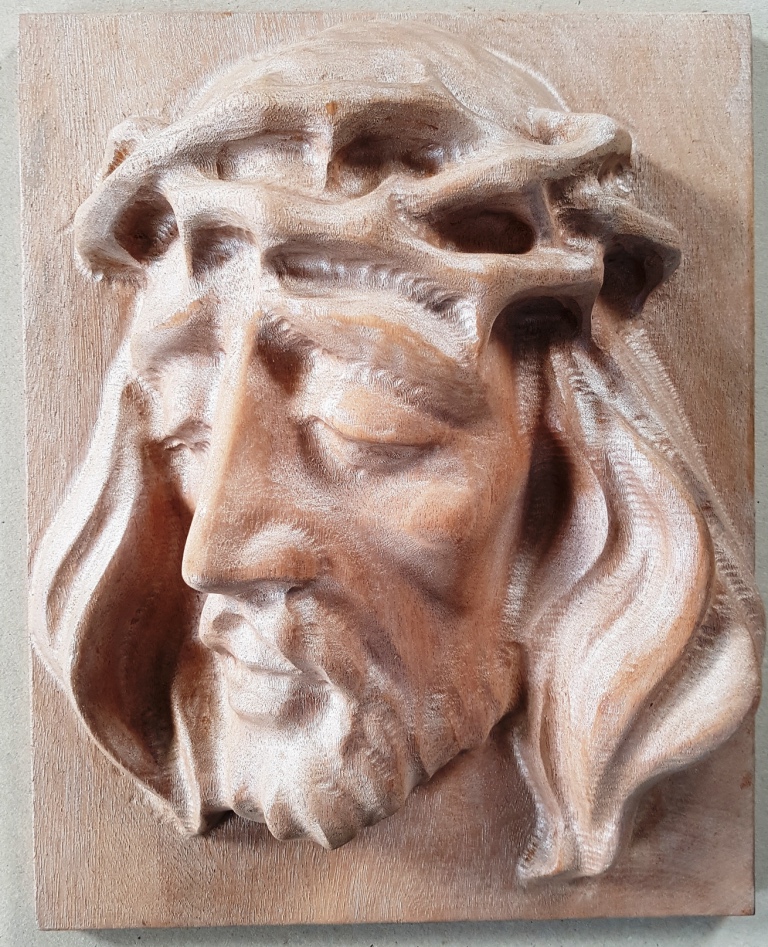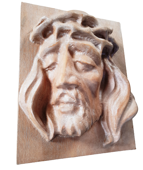 Piękna płaskorzeźba z wizerunkiem Chrystusa. Wykonana w egzotycznym drewnie sapelli. Malowana ręcznie.