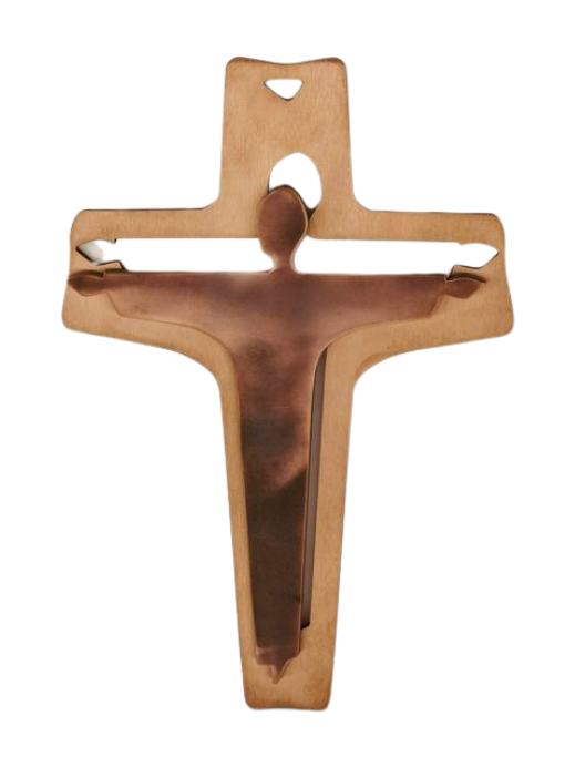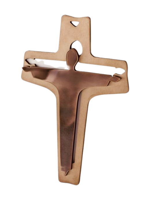 Piękny krzyż naścienny, wykonany ręcznie w całości ze stali nierdzewnej w kolorze antycznego złota.